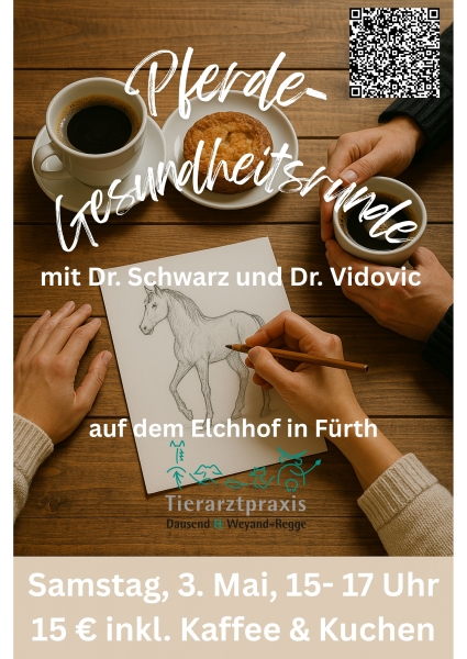 Auf dem Elchhof in FürthErste Pferde-Gesundheitsrunde mit unseren ExpertenWir laden alle Pferdebesitzer herzlich zu einem informativen und gemütlichen Samstagnachmittag auf dem Elchhof ein! Unsere Spezialisten – Dr. Bianca Schwarz (Innere Medizin) und Dr. Aleksander Vidovic (Orthopädie & Chirurgie) – geben kurze Einblicke in ihre Fachgebiete und beantworten Fragen aus dem Alltag mit dem Pferd. Bringen Sie gern eigene Fälle mit – wir besprechen sie gemeinsam! Wann? Samstag, 3. Mai, 15-17 Uhr Kostenbeitrag: 15 € (inkl. Kaffee & Kuchen) Eine tolle Gelegenheit, fachliches Wissen in entspannter Runde zu vertiefen! Sie möchten einen Termin vereinbaren?Rufen Sie uns gerne zu unseren Öffnungszeiten unter der 0 68 55 / 2 58 an.StandortPraxis OberkirchenGartenstraße 866629 Oberkirchen Tel.: 0 68 55 / 2 58 Fax: 0 68 55 / 75 45 E-Mail.: praxis@viehdok.de Wir bitten Termine telefonisch mit uns abzustimmen.