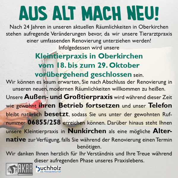 In OberkirchenAUS ALT MACH NEUEs tut sich was in Oberkirchen! Sie möchten einen Termin vereinbaren?Rufen Sie uns gerne zu unseren Öffnungszeiten unter der 0 68 55 / 2 58 an.StandortPraxis OberkirchenGartenstraße 866629 Oberkirchen Tel.: 0 68 55 / 2 58 Fax: 0 68 55 / 75 45 E-Mail.: praxis@viehdok.de Wir bitten Termine telefonisch mit uns abzustimmen.